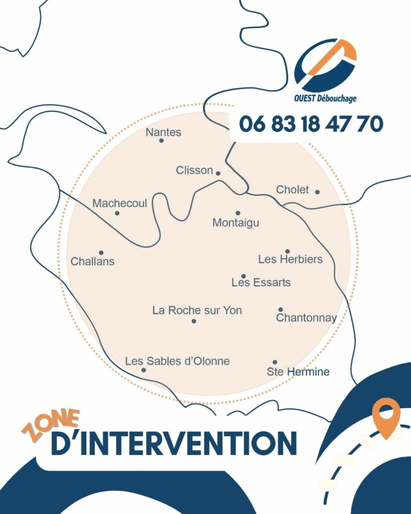 Prestataire local basé à Montaigu-Vendée (85600), nous intervenons sur la Vendée mais sommes également proches de la Loire-Atlantique et du Maine-et-Loire. Notre brigade de déboucheurs atteint le sud de Nantes en quelques minutes, pour des interventions rapide et efficaces sur tous vos problèmes de canalisations, et surtout si ils sont urgents.